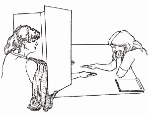 Obr. Dvě osoby sedí u stolu naproti sobě a jsou odděleni lepenkovou přepážkou.