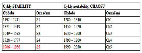 Použité zkratky (období Ch, S) pocházejí z následující tabulky, která znázorňuje výše zmíněné cykly o délce 30 až 50 let, a přiřazuje jim aktuální dějinnou situaci, tedy stabilitu nebo nestabilitu, resp. chaos: