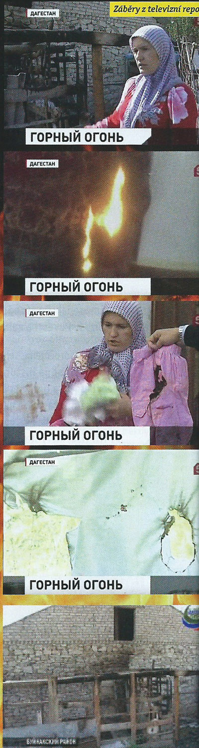 Na záběrech dagestánské televize vidíme následky podivných úkazů – do kruhu propálené záclony, oblečení, koberce a matrace. Kdo kdy měl co do činění s ohněm, ví, že se zde tento nezkrotný živel choval velice nelogicky a podivně. Jako by zde hořelo jen na místech, potřísněných nějakou chemikálií. Kdo by to však dělal? Dospělí? Jejich děti? Kde by se však malé děti v zapadlé vesnici nepozorovaně dostaly k takovým hořlavinám, jejichž stopy neodhalili odborníci z ministerstva pro mimořádné situace? A proč? Aby si zničili vlastní domov?